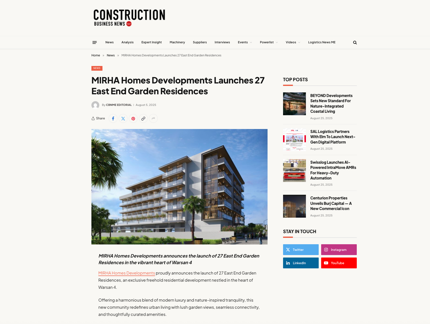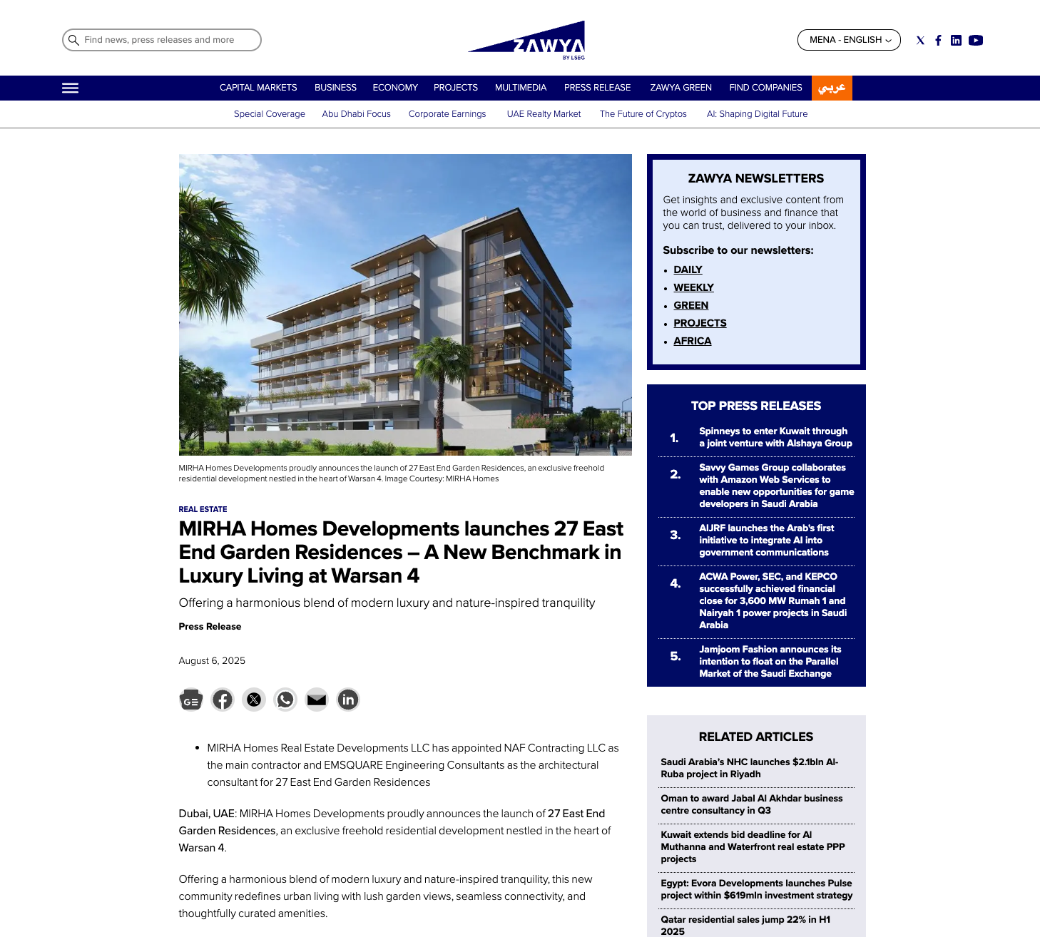 Blitz crafted a highly targeted press release distribution plan, designed to position MIRHA Homes Developments and the 27 East End Garden Residences project as a trusted and credible investment opportunity.